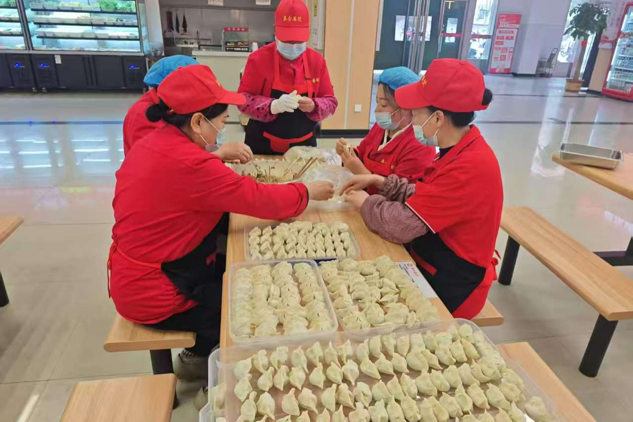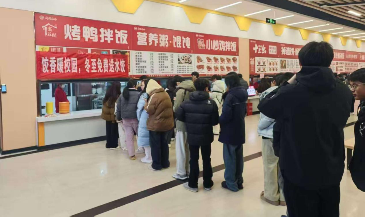 为了让学生和奋战在一线的物业人员在冬至这个传统节日里感受到家的温暖,学校食堂提前进行了细致的筹备工作。餐厅负责人从食材的采购、饺子的包制到活动的组织安排,每一个环节都精心策划。食堂工作人员们早早地忙碌起来,准备了充足的饺子,确保能为大家提供放心美味的节日餐食。同时,食堂的档口也进行了精心布置,醒目的红色横幅“饺香暖校园,冬至免费送水饺”悬挂在上方,营造出浓浓的节日氛围。